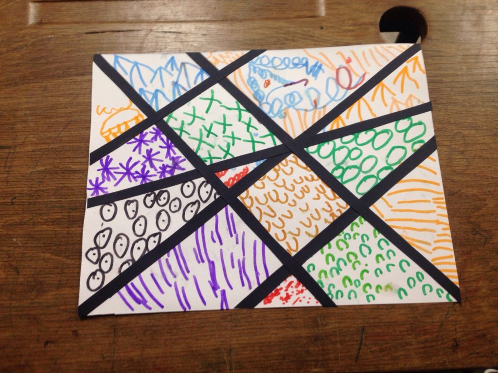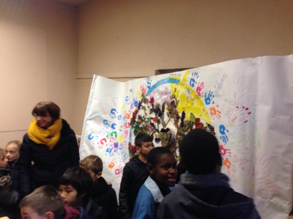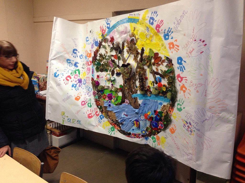 Mandala géant avec des matériaux recyclés fabriqué pendant la semaine bleue par les CE2 et les personnes agés.