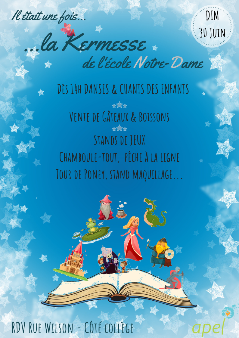 Dans 10 jours, c’est la Kermesse de l’Ecole Notre-Dame, les enfants de la petite section au CM2 vous présenteront leurs danses sur le thème des contes ! Suivra un après-midi de jeux : chamboule-tout, balade en poney, maquillage et bien d’autres ! Nous vous attendons nombreux(ses) !