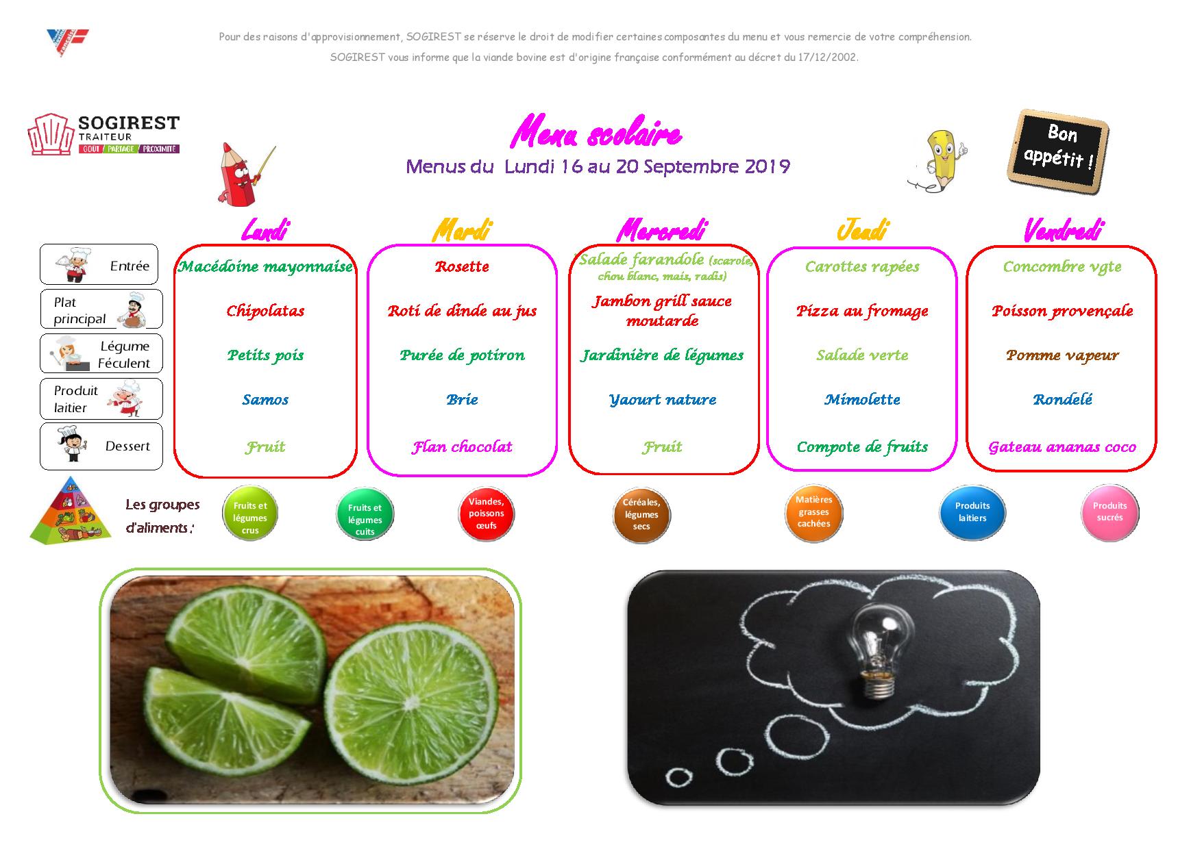Menus cantine du 9 au 13 septembre