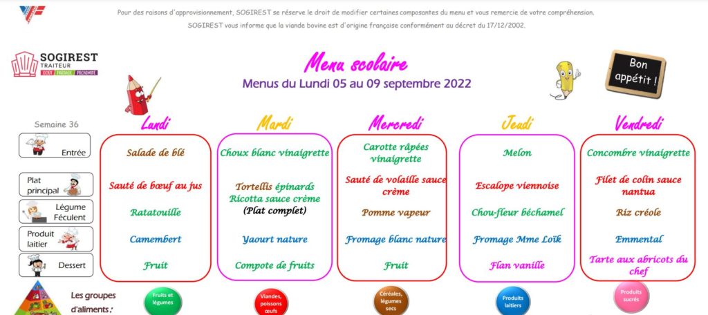 Menus de la cantine du 5 au 9 septembre